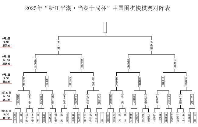 2025年“浙江平湖·当湖十局杯”中国围棋快棋赛由中国围棋协会、平湖市人民政府主办,浙江省围棋协会支持,平湖市文化和广电旅游体育局承办;比赛由等级分前32位参赛,因故不能参赛者根据等级分第33名依次往下递补。32强败者3000元、16强败者5000元、8强败者10000元、4强败者20000、亚军12万、冠军30万。